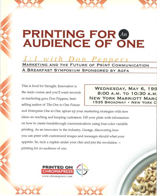 The best way to attract attention to a conference devoted to variable printing technologies is to use that same technology in the invite – creating a customized “alphabet cereal typeface” and outputting the mailer so that each and every recipient’s name is in the bowl. -